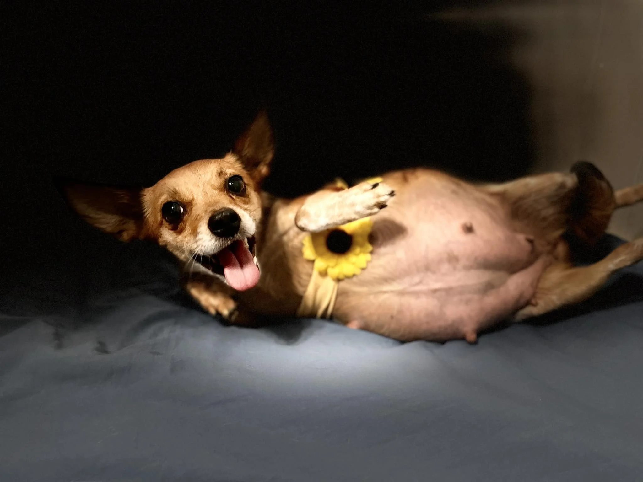 Edamame, a chihuahua, is a recent owner surrender who was impregnated by a basset hound. She is a BIG 19 lbs pregnant.